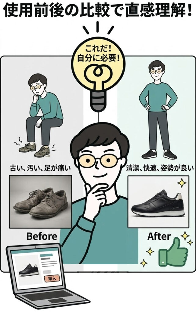 商品画像に「使用前後の比較」や「お悩み解決をイメージさせるビジュアル」を取り入れることで、